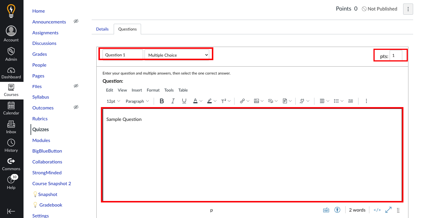 - Fill in the question name, question type, points and text of the question.