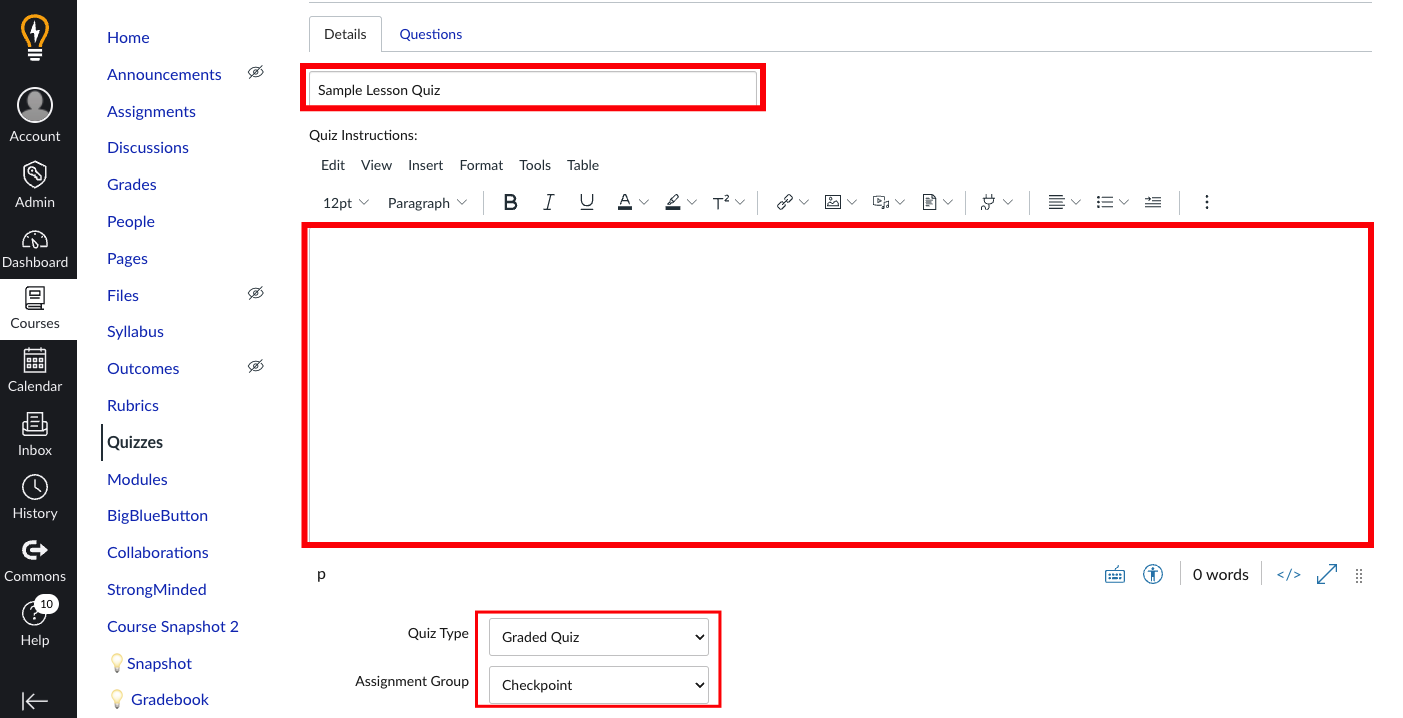 - Fill in a quiz title, description, quiz type and assignment group.