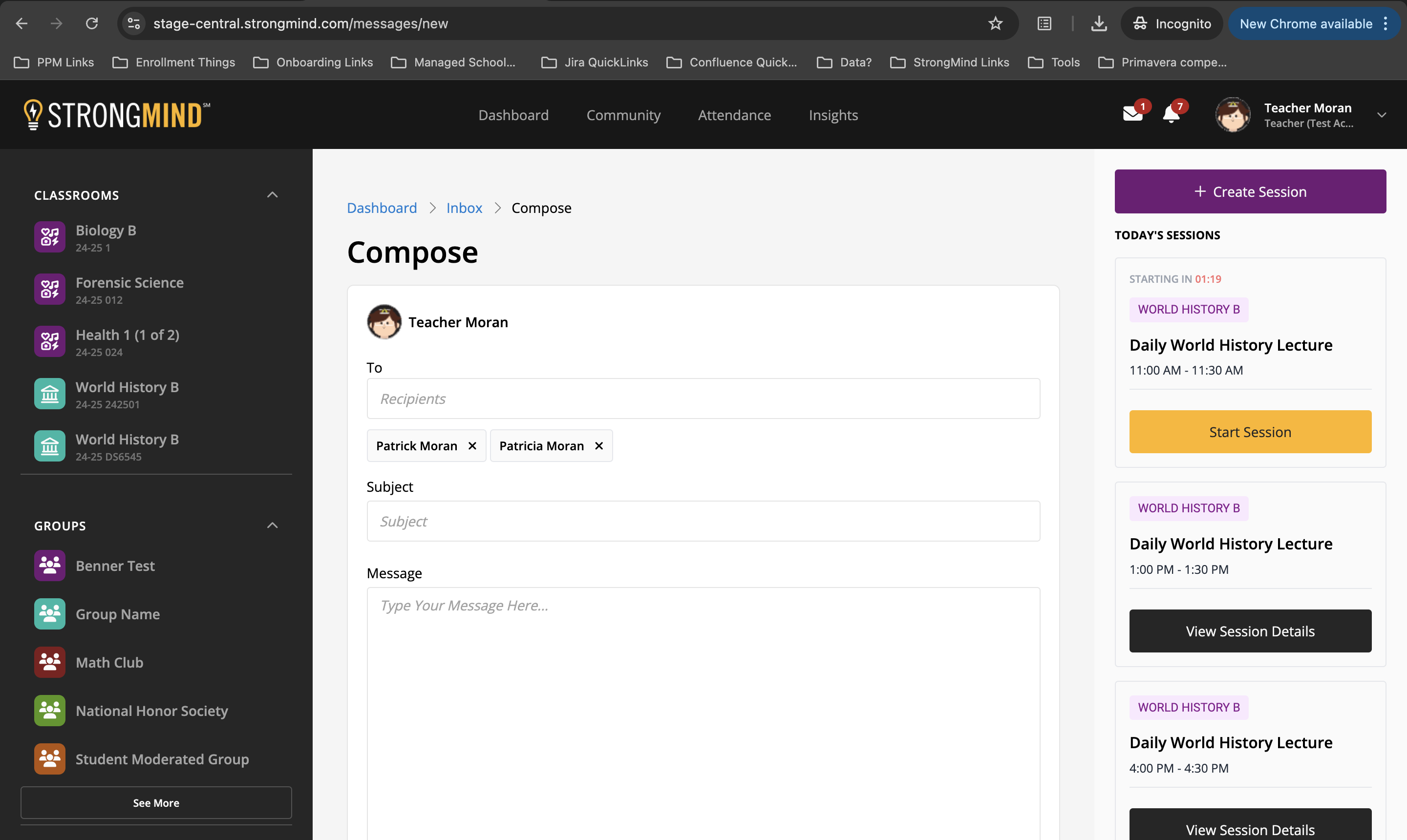 Notes: Teachers now have the ability to send a student or group of students a message directly within StrongMind Central, where it will automatically be logged in the system for auditing purposes and land directly in the students' StrongMind Central inbox for review.